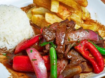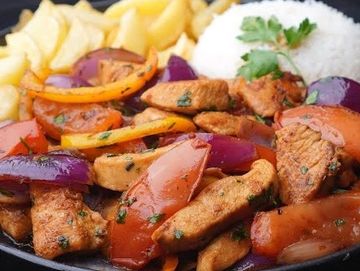 Grass-fed steak, onions, tomatoes, sauteed in a special sauce with rice and french fries.