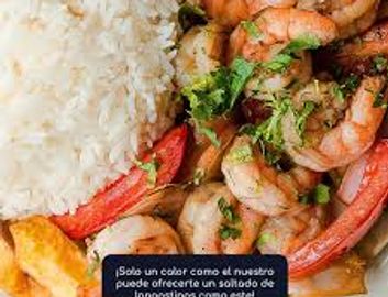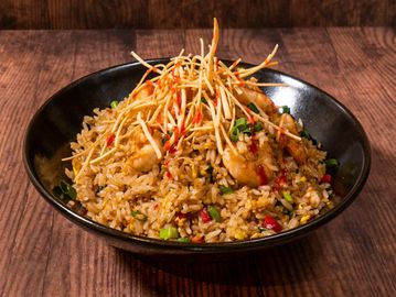 Large prawns, fried rice, mixed with vegetables including onions, red peppers and egg.