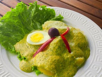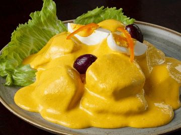 A mild Aji amarillo and cheese sauce, served over-sliced boiled potatoes, garnished with a boiled egg and Peruvian black olives.