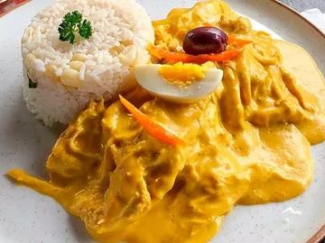 Chicken cooked in a flavorful cream sauce with milk cheese aji and pecans served with rice and boiled potatoes.
