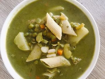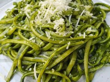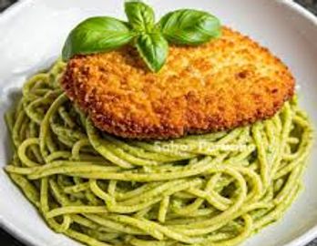 Peruvian-style Pesto with spaghetti and breaded chicken