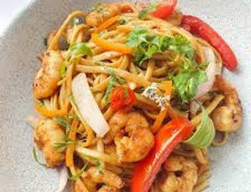 Peruvian-Chinese lo mein, stir fried with prawns, red pepper, and scallions, with special Peruvian spices