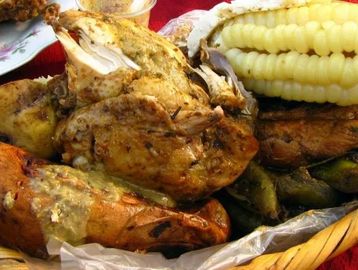 An ancient Inca dish from the Andes of Peru, where meat, chicken, corn and potatoes are cooked with herbs in an underground earth oven, from the Quechua “pacha” for earth, and “manca” for oven.