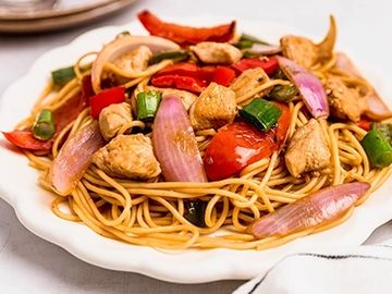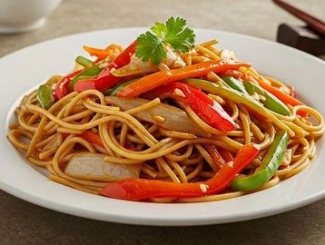 Peruvian-Chinese lo mein, stir fried with chicken, snow peas, red pepper, with special Peruvian spices.