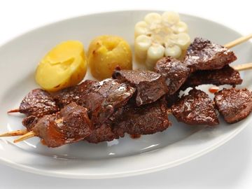 Made by marinating savory chunks of meat in spicy or tangy sauces and then grilled to perfection with Peruvian corn and boiled potatoes.